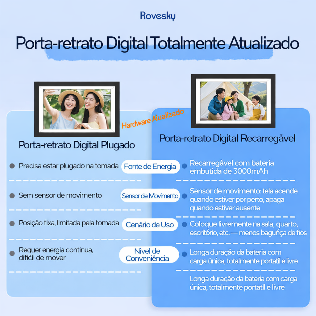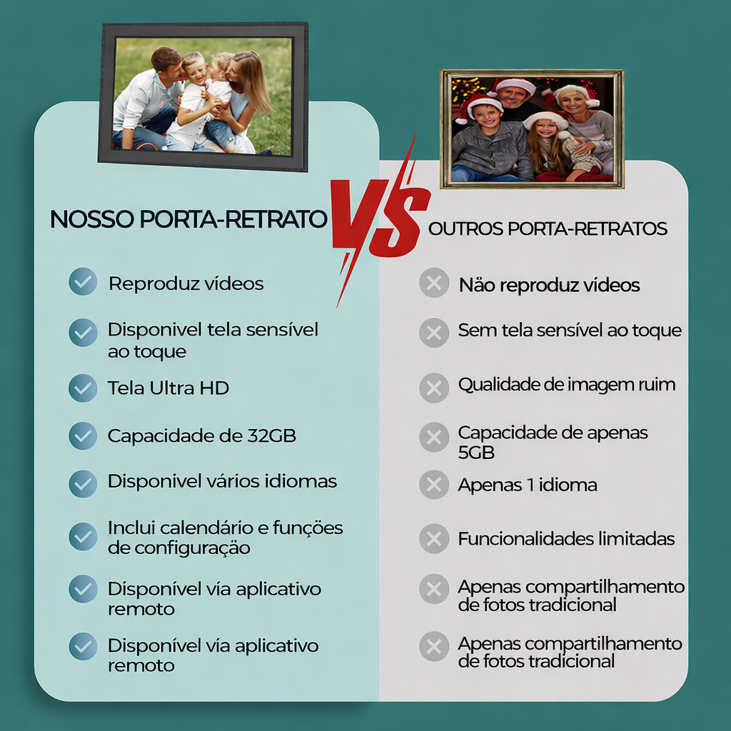 Suporta Wi-Fi, exibição de fotos, reprodução de vídeo, tela sensível ao toque, display HD, compartilhamento entre múltiplos usuários, porta USB e armazenamento de 32 GB.